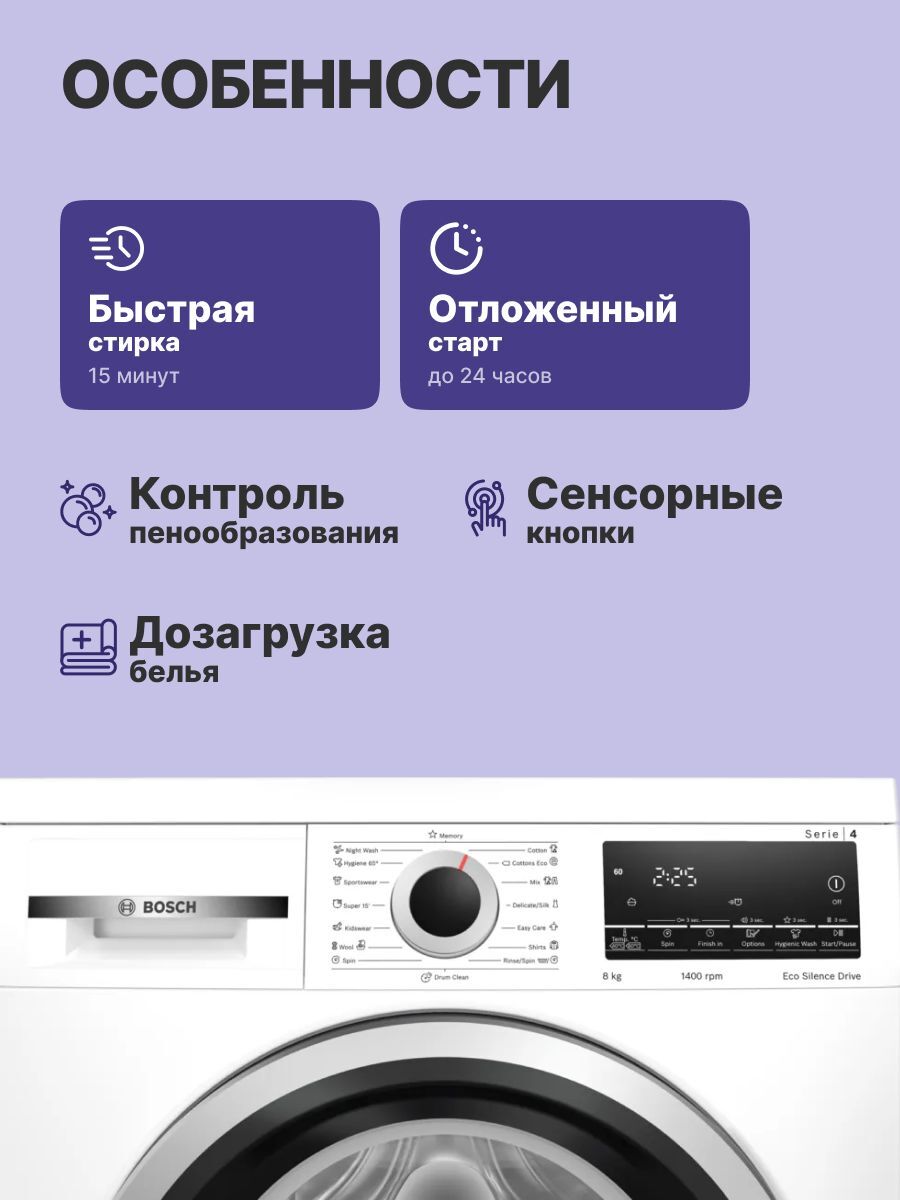Благодаря классу энергоэффективности A+++ модель потребляет минимум электроэнергии, что снижает расходы на коммунальные платежи. Стиральная машина оснащена множеством программ, позволяющих подобрать оптимальный режим для разных типов тканей. Тихая работа и надежность Bosch делают эту модель отличным выбором для тех, кто ценит качество и комфорт в повседневной жизни.