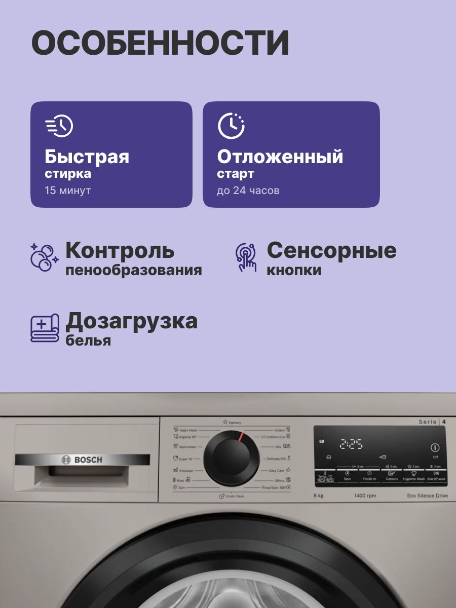 BOSCH WLS2846SME – это современная отдельностоящая стиральная машина с эргономичными габаритами (850?595?470 мм), которая идеально впишется в любое помещение. Благодаря загрузке до 8 кг она легко справляется с большими объемами белья, а скорость отжима 1400 об/мин обеспечивает эффективное удаление влаги, сокращая время сушки. Стильная серебристая панель с дисплеем придает технике лаконичный и технологичный вид, а интуитивно понятное управление делает использование максимально удобным.