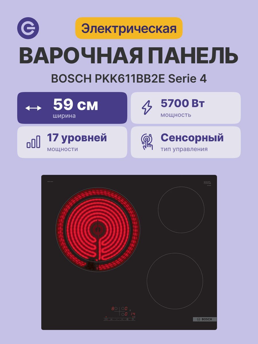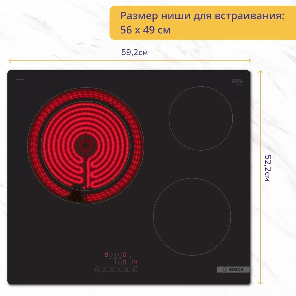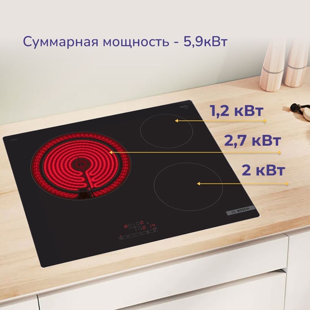 Электрическая варочная поверхность Bosch PKK611BB2E оснащена 3 круглыми зонами нагрева для комфортного приготовления домашней пищи. Стеклокерамическая панель устойчива к повреждениям и легко очищается. Одна из конфорок двухконтурная, то есть предусматривает расширение зоны приготовления в зависимости от размера посуды.