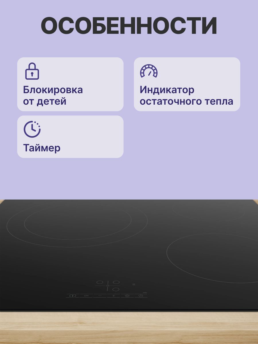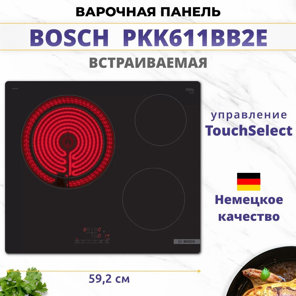 Сенсорная панель TouchControl обеспечивает простое и удобное управление. Таймер позволяет программировать определенное время работы конфорок и оповещает о его завершении звуковым сигналом. Функция перезапуска ReStart в случае пролития жидкости или отключения энергии запоминает установленные параметры. Технология защитного отключения и индикаторы остаточного тепла повышают безопасность в эксплуатации варочной поверхности Bosch PKK611BB2E.