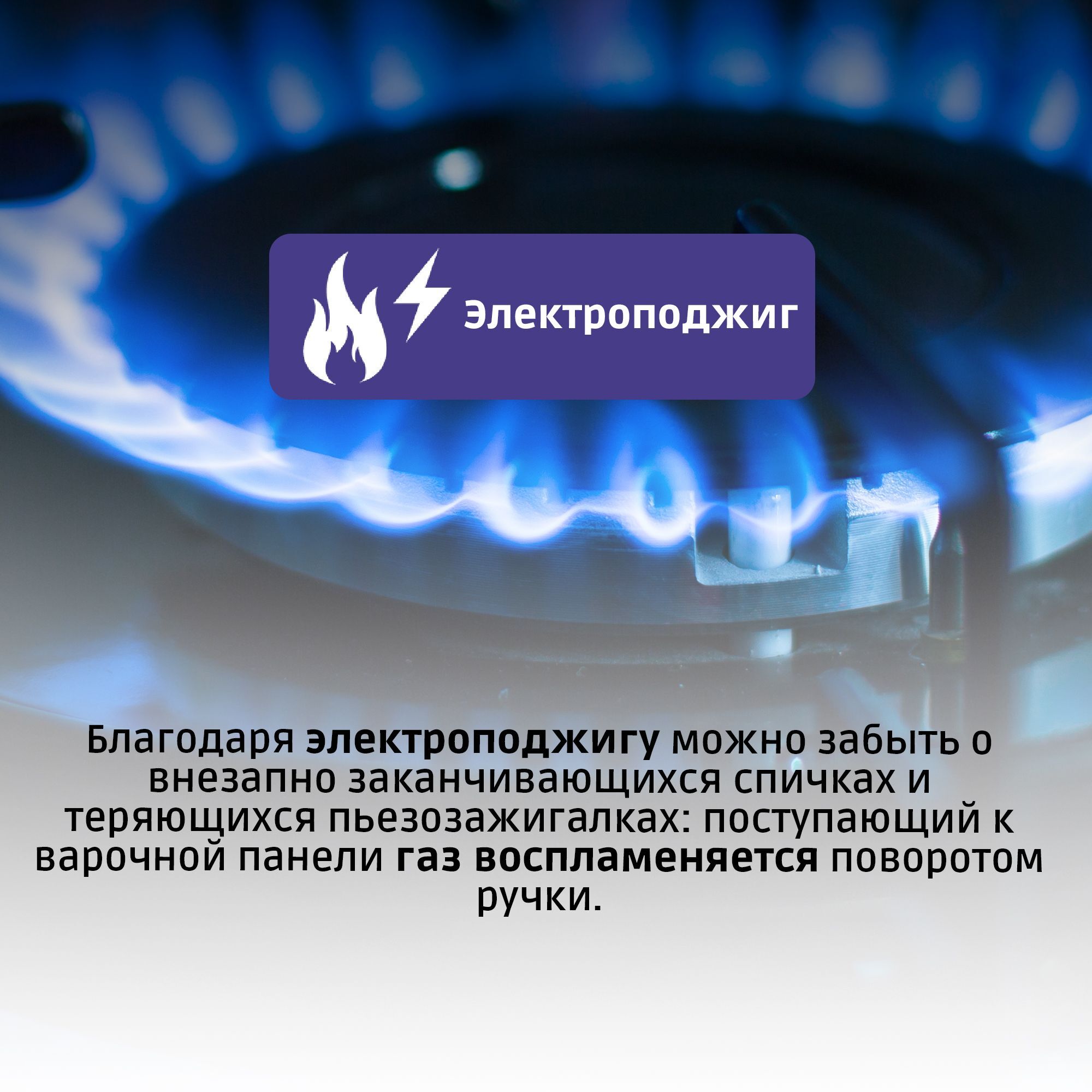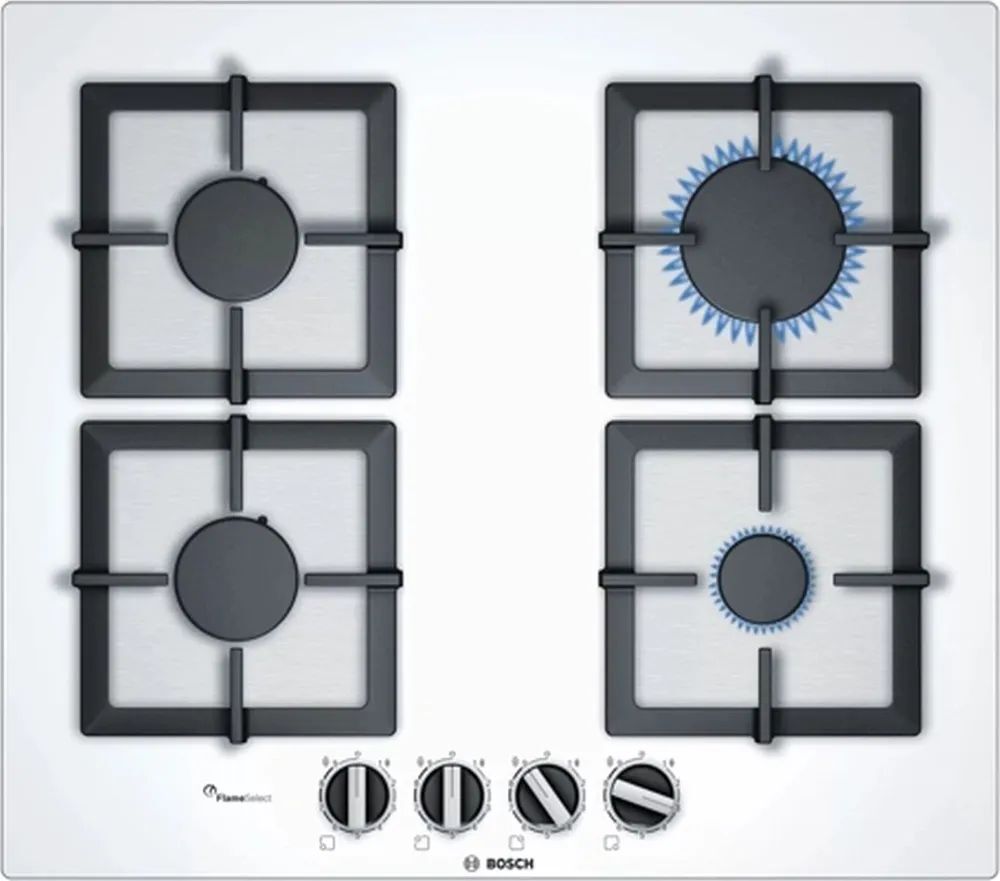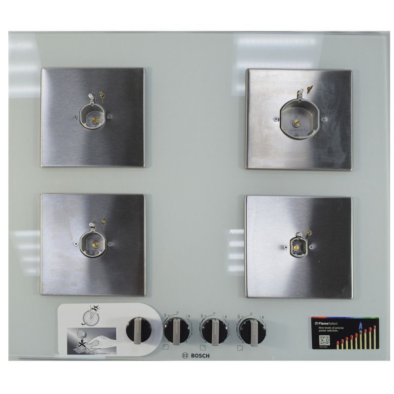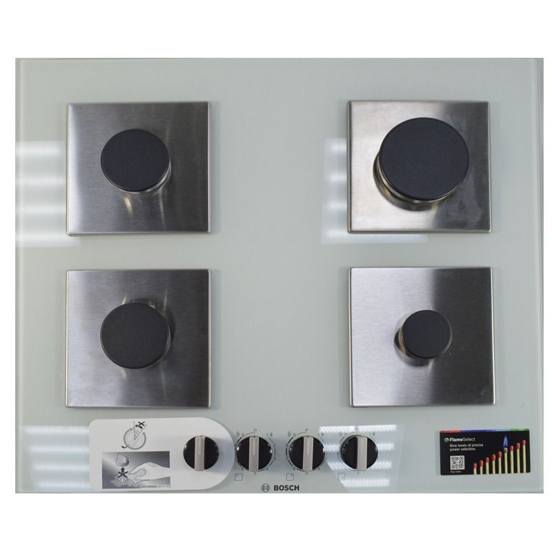 Газовая варочная панель из закаленного белого стекла с четырьмя конфорками. Область вокруг конфорок имеет цвет нержавеющая сталь. Технология FlameSelect позволяет точно регулировать размер пламени с девятью определенными уровнями мощности. Функция газ-контроля в автоматическом режиме приостановит подачу голубого топлива, как только потухнет пламя одной из конфорок, что значительно повышает безопасность при эксплуатации варочной панели. Электроподжиг встроен в поворотные переключатели для большего удобства.